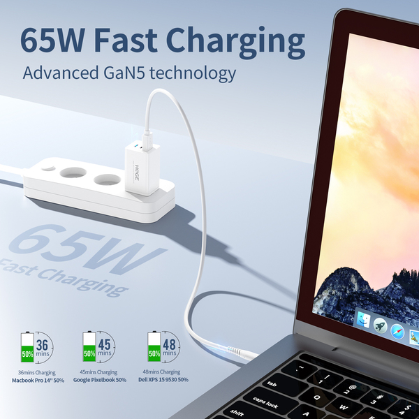Kompakt und Tragbar: Das Ladegerät sowohl hat ein kompaktes und tragbares Design, darüber hinaus auch ist ein Must-Have für unterwegs. Er ist 40 % kleiner als herkömmliche sperrige 65W Ladegeräte. Mit dem enthaltenen 1 Meter Ladekabel passt er perfekt für Nachttisch, Büro und Reisen.