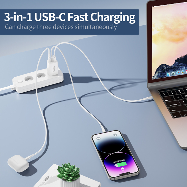 3-in-1 Allrounder: Das Ladegerät ist mit zwei USB-C- und einem USB-A-Anschluss ausgestattet, um sowohl drei andere Ladegeräte zu ersetzen, als auch das Gewicht des Gepäcks und das Kabelgewirr zu reduzieren. Mit der intelligenten Stromverteilung kann er bis zu drei Geräte gleichzeitig und ungefährdet aufladen. Wo immer Sie sind, ein H&GE Ladegerät ist genug.